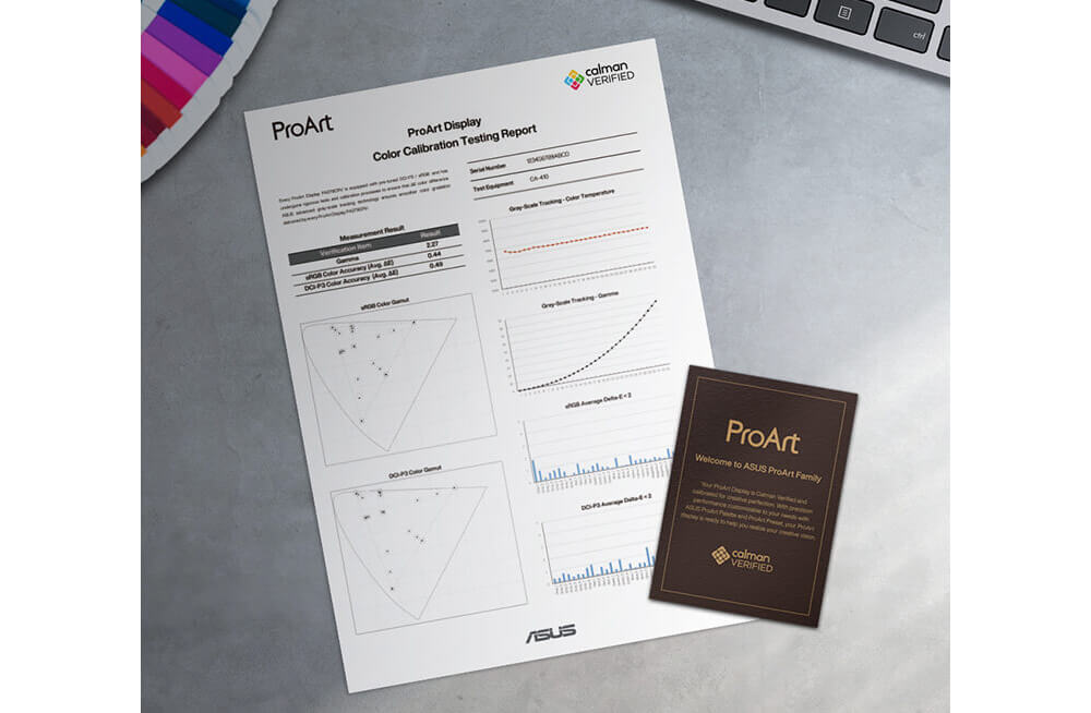 Color professionals rely on color-accurate displays to ensure that their creations look exactly as intended. Each ProArt display is calibrated in the factory to meet Calman Verified standards and to achieve Delta E<2 color accuracy.