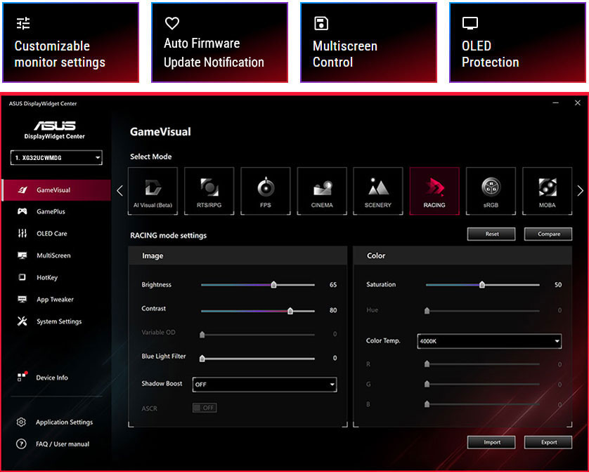 DisplayWidget Center is a powerful monitor management software designed to help users optimize, personalize, and fully utilize their display via a mouse - so there’s no need to access the OSD menu. Additionally, DisplayWidget Center offers firmware update notifications and includes a direct update option. Users can also import or export display configurations for sharing.