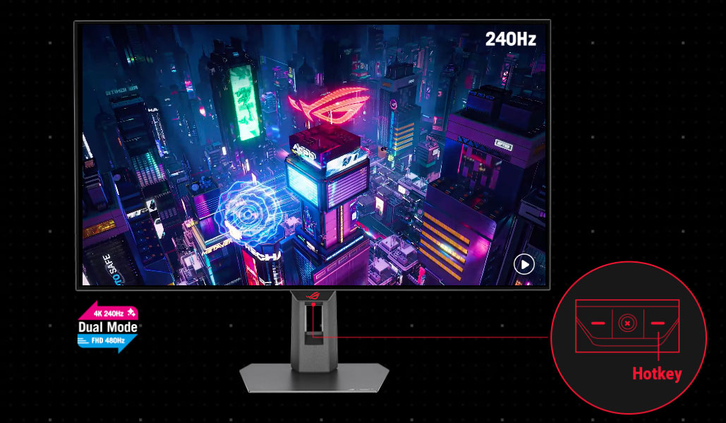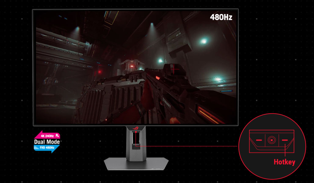 The ROG Strix OLED XG32UCWMG offers unparalleled flexibility with its dual-mode feature, enabling users to prioritize refresh rate for fast-paced action or extreme resolution for immersive visuals. A simple press of the hotkey instantly switches between stunning 4K@240Hz imagery for AAA titles and blazing-fast FHD@480Hz for FPS gaming.