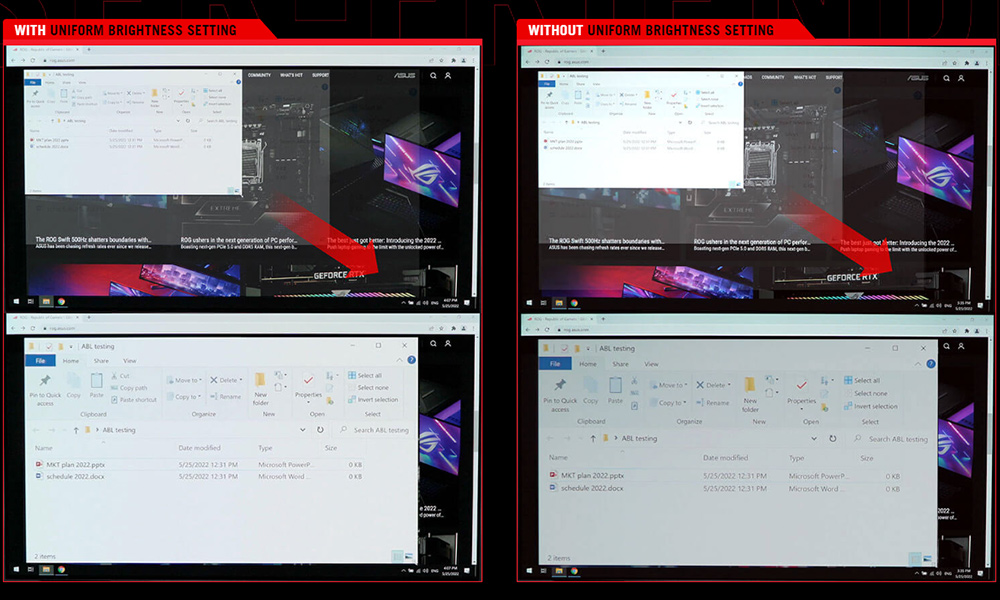 When activated, the ROG-exclusive Uniform Brightness* setting within the OSD menu decreases peak brightness to keep levels consistent for better viewing-even when changing the size of bright white windows. It also makes marathon gaming sessions much more comfortable on the eyes.