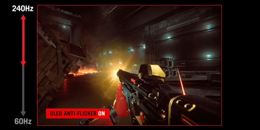 ROG-exclusive OLED Anti-Flicker technology offers three refresh rate ranges - High, Mid, Off - to reduce flicker during frame rate fluctuations and maintain an immersive gaming experience.