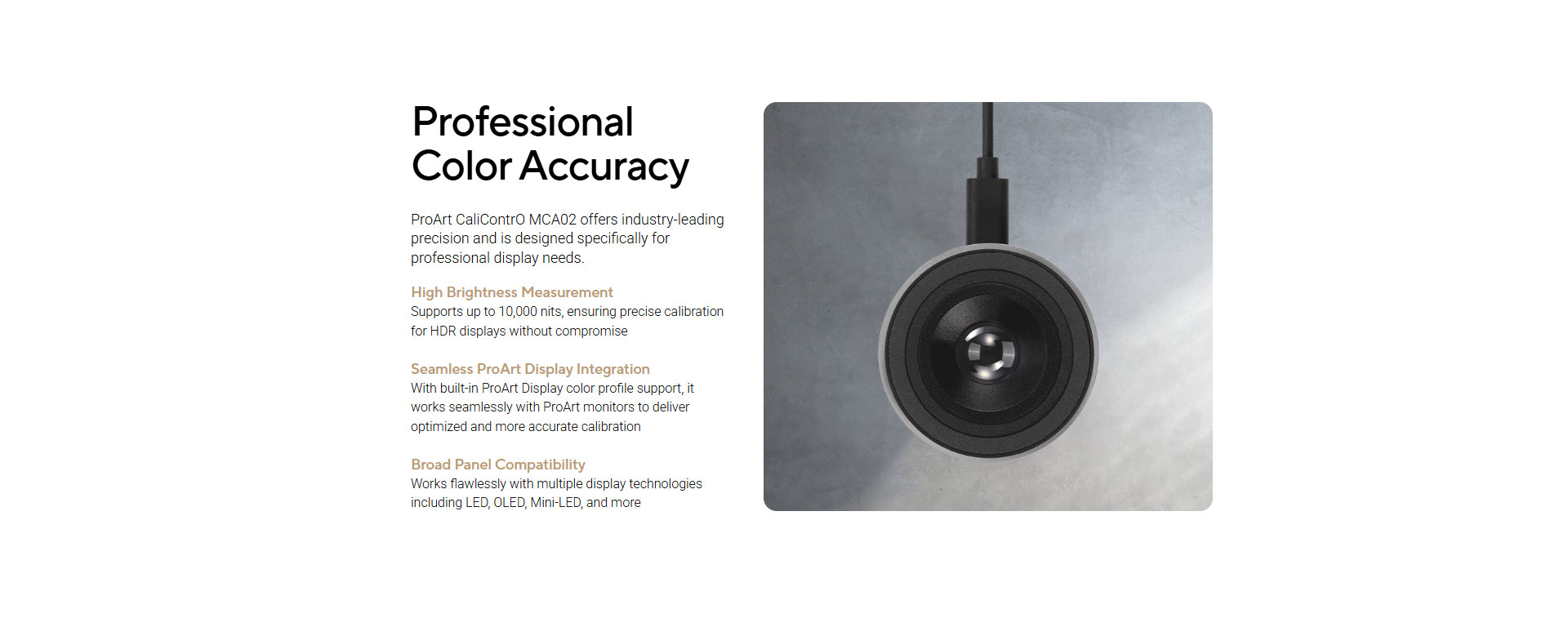 Now, what makes MCA02 particularly relevant for modern creators is ASUS’s emphasis on HDR calibration headroom (up to ~10,000 nits measurement). That doesn’t mean your monitor will display 10,000 nits—very few do—but it signals the sensor is intended to measure across high-luminance HDR scenarios without clipping out early.