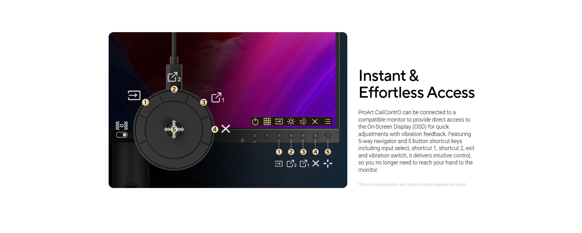 ASUS describes a 5-way navigator and shortcut key for intuitive OSD control, designed so you can reach it easily rather than fumble behind the display.