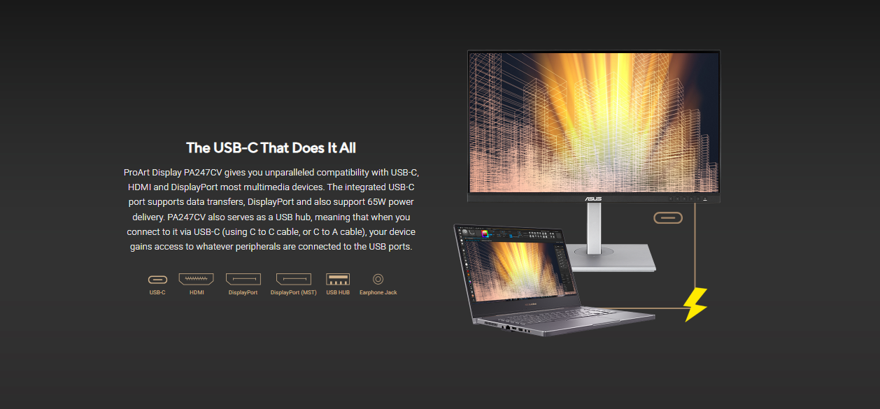 ASUS also includes HDMI, DisplayPort, DisplayPort MST for daisy-chaining, a USB hub, and an earphone jack. In real-world terms, this means the PA247CV can serve as the center of a clean workstation. You can plug in a laptop via USB-C, attach peripherals to the monitor, and expand into a second display more easily. That is the kind of feature set that makes a monitor genuinely productivity-friendly, especially in professional environments where desk simplicity matters.