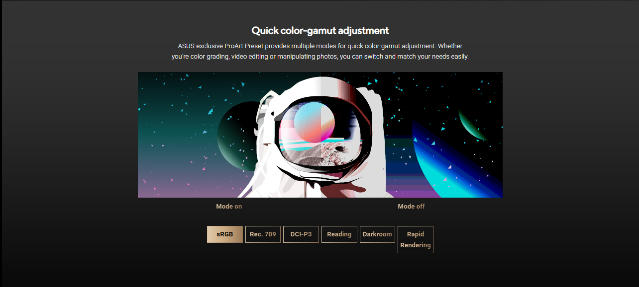 This is one of the strongest reasons to consider the PA247CV over a generic office IPS monitor. Many mainstream monitors look decent, but they are not necessarily tuned for color-critical work. The ProArt line is built around predictable, standards-based color behavior. On the PA247CV, that includes not just gamut coverage but also factory calibration, Calman verification, and access to ProArt Preset modes for fast color-space adjustment. ASUS highlights sRGB, Rec. 709, DCI-P3, Reading, Darkroom, and Rapid Rendering among the available preset-oriented workflow options shown on the product page.