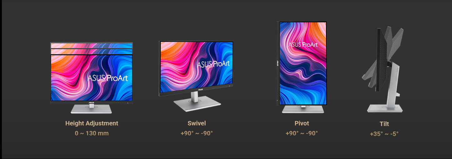 ASUS has kept the PA247CV clean and professional, in line with the broader ProArt series. This is a monitor designed to fit into editing rooms, agency workstations, and productivity-heavy desks without looking flashy or distracting. The fully ergonomic stand is one of its biggest strengths. ASUS specifies height adjustment from 0 to 130 mm, swivel from +90° to -90°, pivot from +90° to -90°, and tilt from +35° to -5°. That range is excellent for a monitor in this class and makes it easy to adapt the screen for portrait editing, long-document review, coding, and general posture comfort. ASUS also notes that the quick-release stand works with the built-in VESA mounting system, which is useful for arm-mounted setups.