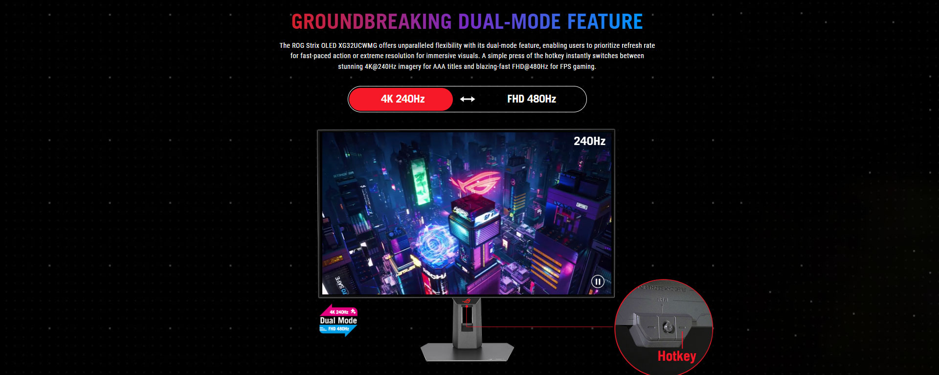 It runs 4K@240Hz for detail and switches to 1080p@480Hz (Frame Rate Boost) for maximum smoothness.