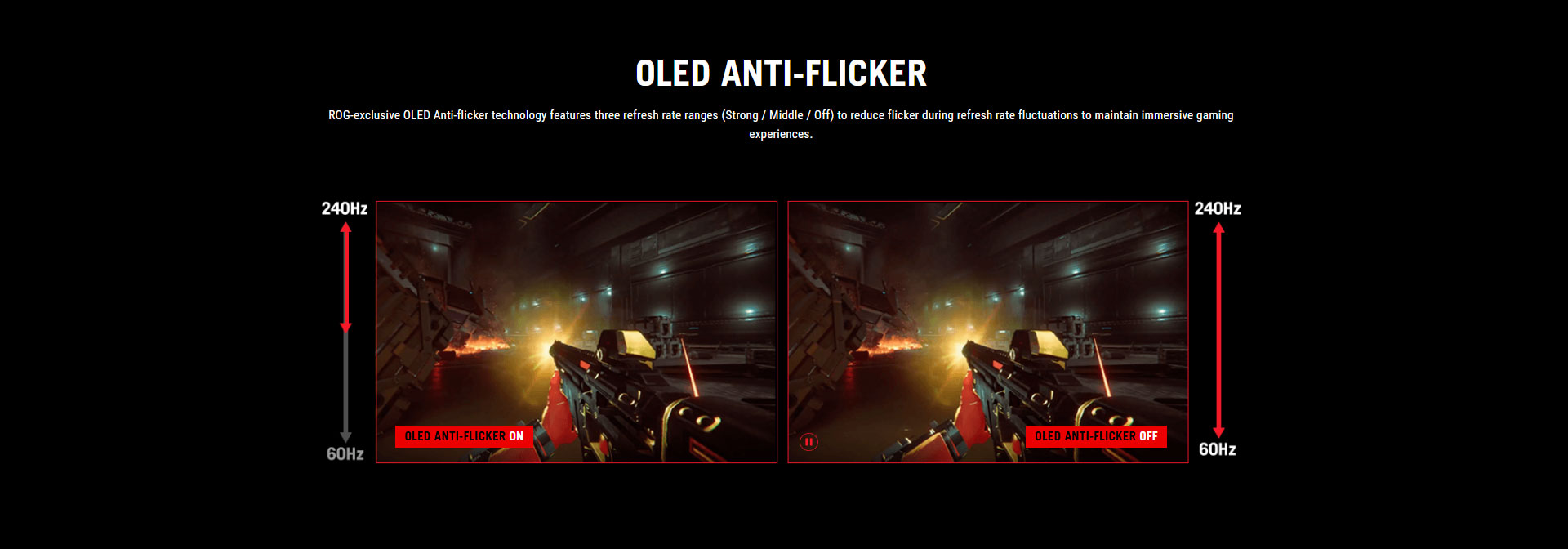 ASUS has published guidance on OLED flicker and how its anti-flicker approaches work, including algorithmic compensation in newer implementations (ROG OLED Anti-Flicker 2.0 is described as using luminance compensation based on real-time detection).