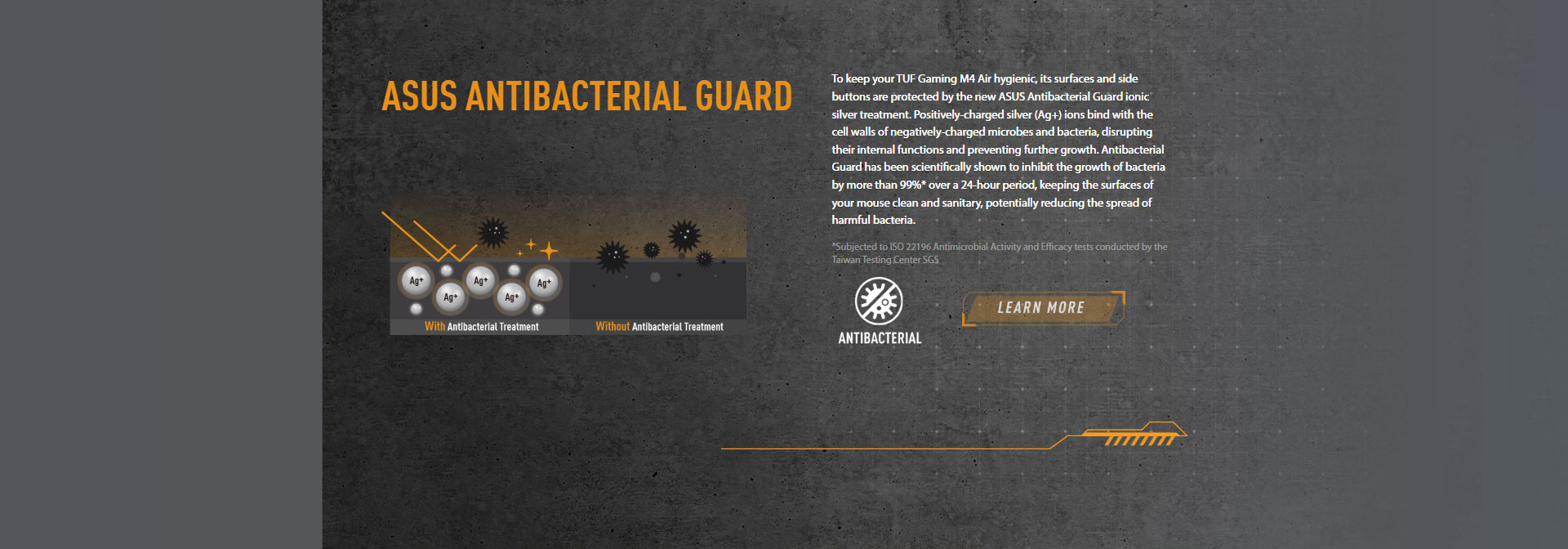 Antibacterial Guard is a surface treatment claim (ionic silver) and ASUS states it inhibited bacterial growth by more than 99% over 24 hours under ISO 22196 testing (as claimed on the product page).