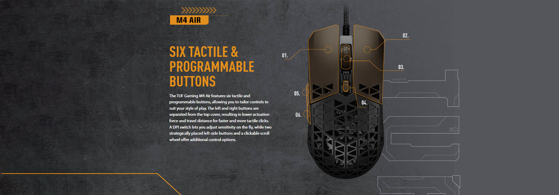 ASUS uses a separated-button design (L/R separated from top cover) to reduce actuation force and travel for snappier clicks, and includes a DPI switch plus two side buttons.