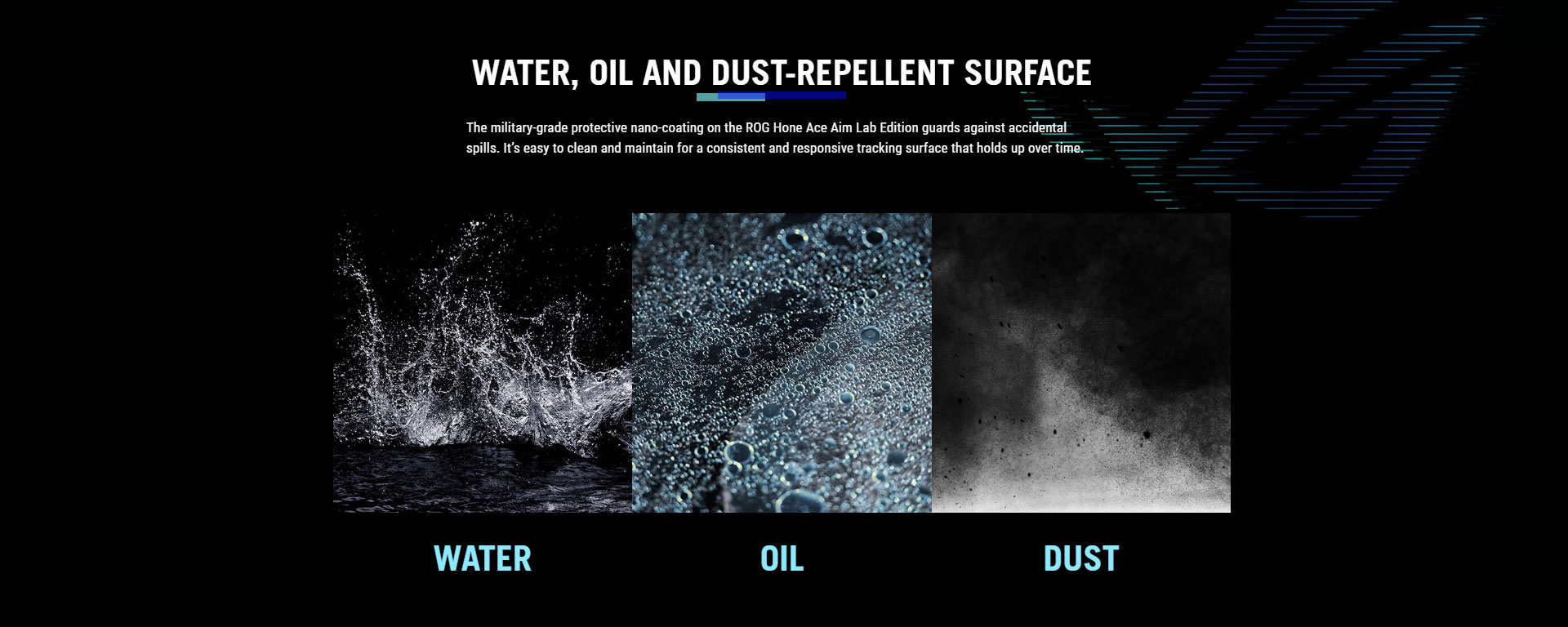 ASUS describes a protective nano-coating that repels water, oil, and dust, and highlights easy cleaning/maintenance to keep the surface consistent.